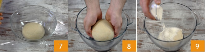 Legen Sie ihn in eine Schüssel, decken Sie ihn mit Frischhaltefolie ab 7 und lassen Sie ihn bei Raumtemperatur etwa 2 Stunden ruhen. Nach dieser Zeit ist der Teig nicht stark aufgegangen, geben Sie ihn zurück in die Schüssel der Küchenmaschine 8. Fügen Sie das Mehl hinzu 9 und starten Sie den Knethaken.