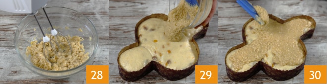 Arbeiten Sie mit einem elektrischen Mixer, bis eine homogene und cremige Masse entsteht 28. Geben Sie die Glasur dann auf die Colomba 29 und streichen Sie sie mit einem Spatel über die gesamte Oberfläche 30.