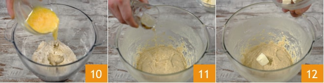 Geben Sie die verquirlten Eier nacheinander hinzu 10 und den Rum 11. Während Sie weiter kneten, fügen Sie Stück für Stück die Butter hinzu, und warten Sie, bis das vorherige Stück vollständig aufgenommen ist, bevor Sie das nächste hinzufügen 12. Diese Phase ist sehr empfindlich und dauert etwa 15 Minuten.