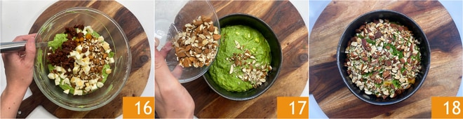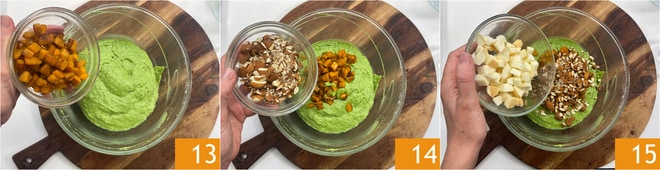 Dann können Sie alle Füllzutaten hinzufügen: den Kürbis 13, die grob gehackten Mandeln 14 und den in Würfel geschnittenen Scamorza 15.