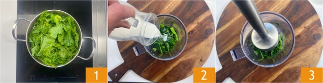 Um den schnellen salzigen Panettone zuzubereiten, reinigen und kochen Sie den Stängelkohl etwa 8 Minuten lang in kochendem Salzwasser nach Geschmack 1. Sie benötigen etwa 500 g Kohl, nach dem Reinigen und Kochen sind 250 g für das Rezept erforderlich. Sobald sie fertig sind, können Sie sie sofort in einer Schüssel mit Wasser und Eis abkühlen, damit die Farbe leuchtend bleibt. Abgießen und mit einem Stabmixer zusammen mit der Milch pürieren 2 3.