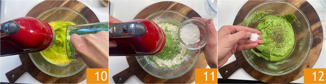 Jetzt können Sie auch die Stängelkohl-Creme 10, das gesiebte Mehl und Backpulver 11, das Salz 12 und den Pfeffer hinzufügen.
