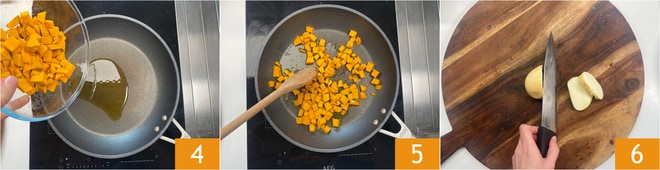 Entfernen Sie die Kürbisschale und die inneren Kerne, geben Sie das Fruchtfleisch mit einem Schuss Öl in die Pfanne 4, salzen Sie nach Geschmack. Gelegentlich umrühren 5 und etwa 10 Minuten bei mittlerer Hitze kochen, die Würfel sollten weich werden, aber dennoch fest bleiben. Auf einem Schneidebrett können Sie den geräucherten Scamorza in Würfel schneiden 6.