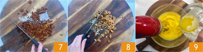 Hacken Sie auch die getrockneten Tomaten grob 7 und die Mandeln 8. Jetzt, da Sie alles vorbereitet haben, können Sie sich dem Teig widmen. Zuerst die Butter bei schwacher Hitze schmelzen und abkühlen lassen. Dann beginnen Sie, die Eier mit einem elektrischen Mixer zu schlagen, fügen Sie die abgekühlte geschmolzene Butter in einem dünnen Strahl hinzu 9, während Sie weiter mit den Mixer arbeiten.