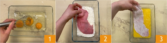 Um die Schnitzel zuzubereiten, tupfen Sie zuerst die Kalbsschnitzel mit Küchenpapier gut trocken. Bereiten Sie die Zutaten für die Panade vor: salzen Sie die Eier und verquirlen Sie sie in einer Schüssel 1, dann geben Sie das Mehl und die Semmelbrösel in zwei weitere große Behälter. Zuerst mehlen Sie die Schnitzel von beiden Seiten ein 2. Anschließend wenden Sie sie im verquirlten Ei 3.