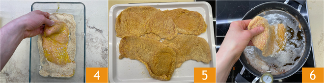 Zum Schluss bedecken Sie sie gleichmäßig mit den Semmelbröseln 4. Legen Sie die panierten Schnitzel auf ein Tablett 5 und erhitzen Sie das Pflanzenöl in einer großen Pfanne bis auf 170°. Tauchen Sie ein Schnitzel nach dem anderen hinein 6 und frittieren Sie es etwa 3 Minuten lang, wobei Sie mit einer Schöpfkelle auch heißes Öl über die Oberseite gießen, um eine gleichmäßige Bräunung zu erzielen.