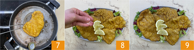 Sobald das Schnitzel schön goldbraun ist, nehmen Sie es heraus 7 und lassen es auf Küchenpapier oder Frittierpapier abtropfen. Fahren Sie so fort, bis auch die übrigen panierten Scheiben frittiert sind. Salzen Sie nach Geschmack 8 und servieren Sie die Schnitzel sofort, zusammen mit einigen Zitronenspalten 9!