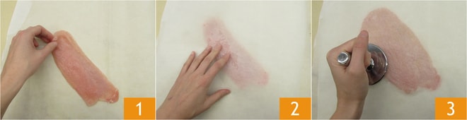 Um die Schnitzelröllchen zuzubereiten, legen Sie die Fleischscheiben zwischen zwei Blätter Backpapier 1 2 und klopfen Sie sie mit einem Fleischklopfer 3.