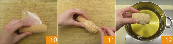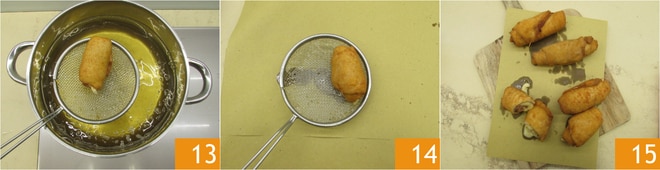 Einmal aufgerollt 10, mit einem Zahnstocher verschließen 11. Für das Garen können Sie sie in reichlich Pflanzenöl frittieren, das nicht über 180°C erhitzt werden sollte (Sie können die Temperatur mit einem Küchenthermometer überprüfen). Die Röllchen für einige Minuten goldbraun braten 12, dabei wenden, um eine gleichmäßige Garung zu erreichen.