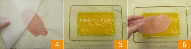 Das Fleisch wird dünner und so brechen die Fasern nicht, und es bleibt zart 4. In einer kleinen Schüssel die Eier aufschlagen und leicht salzen 5 und nach Belieben pfeffern, dann die Eier mit einer Gabel verquirlen 5. Tauchen Sie die Putenfilets nacheinander in das Ei 6.