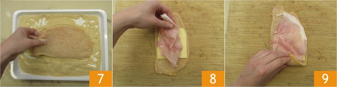Wenden Sie sie dann im Paniermehl 7 auf beiden Seiten. Wenn sie zu groß sind, schneiden Sie sie in zwei oder drei Teile. Auf jede Scheibe eine Scheibe Käse und eine Scheibe gekochten Schinken legen 8. Von der kurzen Seite her aufrollen 9.