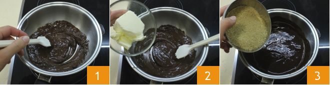 Um die Schokoladen-Crackle-Kekse zuzubereiten, beginnt ihr damit, die Zartbitterschokolade im Wasserbad zu schmelzen: Füllt einen Topf zu einem Viertel mit Wasser, stellt eine Schüssel darauf, gebt die Schokoladenstücke hinein (alternativ könnt ihr Schokoladentropfen verwenden) und erhitzt es bei sehr niedriger Hitze, bis die Schokolade eine flüssige Konsistenz erreicht hat 1. Dann fügt ihr die Butter hinzu 2, während ihr mit einem Holzlöffel umrührt, um alles zu vermischen. Anschließend den braunen Zucker hinzufügen 3.