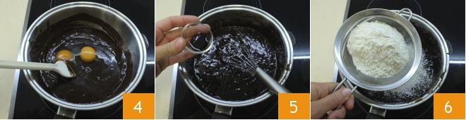 Fügt die Eier hinzu 4 und rührt um. Dann fügt ihr das Vanilleextrakt oder eine Tüte Vanillin hinzu 5 und vermischt es mit einem Schneebesen. Gebt das Mehl und das Backpulver in ein Sieb und siebt es direkt in den Topf 6.