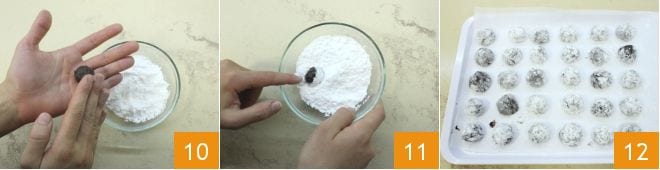 Nach dieser Zeit holt ihr den Teig aus dem Kühlschrank, entfernt die Frischhaltefolie und beginnt, ihn in kleine Stücke zu formen, indem ihr Kugeln mit einem Gewicht von etwa 10 g macht 10. Dann gebt ihr den Puderzucker in eine Schüssel und wälzt die geformten Teigkugeln darin 11. Legt ein Backblech mit Backpapier aus und legt die gezuckerten Kugeln mit ausreichendem Abstand darauf 12. Stellt das Blech zurück in den Kühlschrank und lasst es mindestens eine halbe Stunde ruhen.