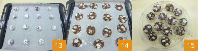 Wenn die Kugeln gut gekühlt und fest sind, legt sie auf ein mit Backpapier belegtes Backblech 13, immer mit ausreichend Abstand, damit sie sich beim Backen nicht berühren. Backt sie im vorgeheizten statischen Ofen bei 180°C für 10-12 Minuten; Wenn ihr einen Umluftofen verwendet, backt sie bei 160°C für 5-7 Minuten, bis sie flach und knusprig sind 14. Lasst sie dann auf einem Gitterrost abkühlen 15 und schon könnt ihr eure Schokoladen-Crackle-Kekse einen nach dem anderen genießen!