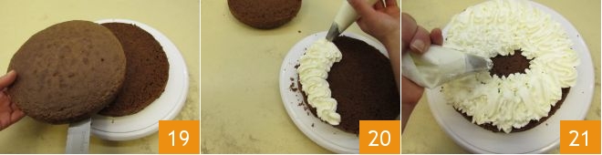 Dann schließt mit der anderen Kuchenschicht 25, drückt leicht und bedeckt die Oberfläche mit der restlichen Schlagsahne 26, indem ihr mit einem Spatel ein weiches Dekorationseffekt erzeugt 27