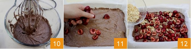Bearbeiten Sie alles, um eine homogene und dichte Konsistenz zu erzielen 10, dann geben Sie den Teig in eine 20x30 cm große, relativ tiefe Form, die mit zuvor angefeuchtetem Backpapier ausgelegt ist, um es leichter darin verteilen zu können. Verteilen Sie den Teig und dann gleichmäßig die Kirschen und die Mandelstreifen (11-12).