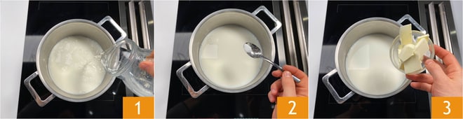 Um den Schokoladen-Migliaccio zuzubereiten, erhitzen Sie in einem Topf Milch, Wasser 1, Salz 2 und Butter 3.