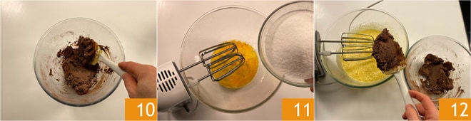 Vermischen Sie alles und stellen es beiseite 10. In einer sehr großen Schüssel schlagen Sie mit einem elektrischen Handmixer die Eier mit dem Zucker 11 für ein paar Minuten, bis sie etwas voluminöser werden. Fügen Sie dann die Ricotta-Kakao-Mischung hinzu 12.