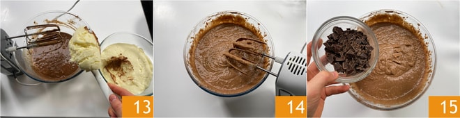 Fügen Sie anschließend den abgekühlten Grieß 13 hinzu und mischen Sie weiter mit dem Handmixer 14. Zum Schluss fügen Sie die gehackte Schokolade hinzu 15.