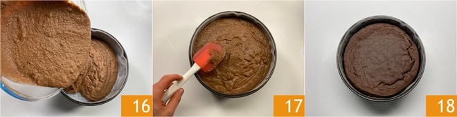 Mischen Sie alles und geben Sie es in eine 24 cm große, gebutterte und mit Backpapier ausgelegte Form 16. Glätten Sie die Oberfläche mit einem Spatel 17 und backen Sie sie im vorgeheizten statischen Ofen bei 180° für etwa 80 Minuten. Lassen Sie den Kuchen vollständig abkühlen 18, bevor Sie ihn für ein paar Stunden in den Kühlschrank stellen und dann servieren.