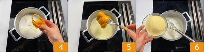 Würzen Sie mit Orangenschale 4. Bringen Sie es bei mittlerer bis hoher Hitze zum Kochen. Sobald es kocht, entfernen Sie die Schale aus den Flüssigkeiten 5 und streuen den Grieß ein 6. Rühren Sie mit dem Schneebesen, um Klumpen zu vermeiden, und kochen Sie bei mittlerer Hitze für 3-4 Minuten.