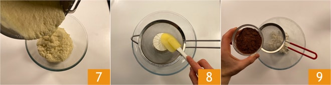 Geben Sie die Mischung in eine Schüssel 7, decken Sie sie mit Frischhaltefolie ab und lassen Sie sie abkühlen. In der Zwischenzeit sieben Sie den Ricotta 8 und fügen den Kakao hinzu 9.