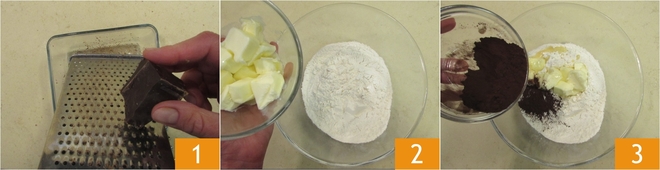 Um den Schokoladen-Orangen-Streuselkuchen zuzubereiten, reiben Sie zuerst die Bitterschokolade mit einer feinen Reibe 1 und bereiten Sie den Teig vor: Geben Sie das Mehl, die kalte Butter in Würfeln 2 und den ungesüßten Kakao 3 in eine Schüssel.