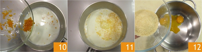 Kommen wir zur Creme: Geben Sie die Milch und die Orangenschale 10 in einen Topf und bringen Sie sie leicht zum Kochen 11. In der Zwischenzeit verrühren Sie die Eigelbe und den braunen Zucker in einem anderen Topf mit einem Spatel, um so wenig Luft wie möglich zu integrieren 12.