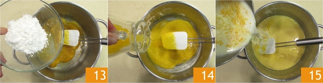 Fügen Sie die Maisstärke hinzu 13 und rühren Sie, bis sie vollständig aufgenommen ist, dann geben Sie den Orangensaft hinzu 14 und rühren erneut. Wenn die Milch heiß ist, gießen Sie sie nach und nach über die Eimischung und rühren weiter 15.