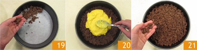 Nach dieser Zeit sind Sie bereit, den Kuchen zusammenzusetzen: Legen Sie eine 20 cm große Form mit Backpapier aus und verteilen Sie die Hälfte des Teigs, um den gesamten Boden zu bedecken 19. Gießen Sie die Orangencreme ein und glätten Sie sie mit der Rückseite eines Löffels, wobei Sie ein paar cm vom Rand frei lassen 20, dann zerbröseln Sie den restlichen Teig, um die gesamte Oberfläche zu bedecken 21.