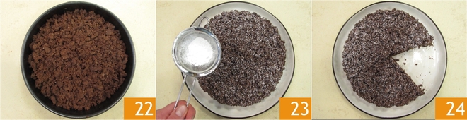 Drücken Sie die Oberfläche des Kuchens vorsichtig mit den Händen an und backen Sie ihn im vorgeheizten statischen Ofen bei 180 °C für 45 Minuten 22. Wenn er fertig ist, aus dem Ofen nehmen und abkühlen lassen. Bestäuben Sie den Schokoladen-Orangen-Streuselkuchen mit etwas Puderzucker 23 und servieren Sie ihn bei Raumtemperatur 24!