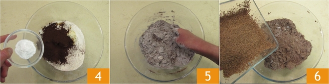 Fügen Sie das Backpulver hinzu 4 und kneten Sie mit den Fingerspitzen, um eine sandige Masse zu erhalten 5. Fügen Sie nun die geriebene Schokolade hinzu 6.
