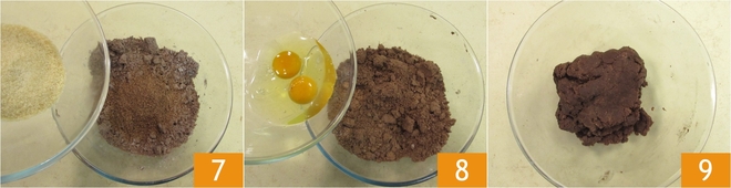 Geben Sie auch den braunen Zucker hinzu 7 und arbeiten Sie mit den Händen, um die Zutaten zu vermischen. Zuletzt geben Sie die Eier hinzu 8 und kneten, bis Sie eine homogene und krümelige Masse erhalten 9. Wickeln Sie den Teig in Frischhaltefolie und legen Sie ihn bis zur Verwendung in den Kühlschrank.