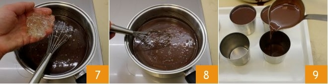Drücken Sie die Gelatineblätter gut aus und fügen Sie sie der Mischung hinzu 7, dann rühren Sie mit einem Schneebesen, bis sie sich vollständig aufgelöst haben 8. Schalten Sie die Hitze aus und gießen Sie die Mischung in 5 Förmchen 9 und lassen Sie sie im Kühlschrank mindestens 4 Stunden fest werden.