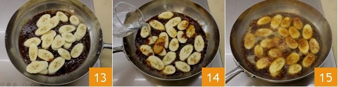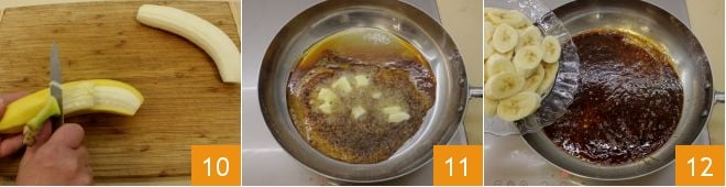 In der Zwischenzeit bereiten Sie die karamellisierten Bananen vor: Schälen Sie sie 10, schmelzen Sie dann in einer Pfanne oder in einem Topf mit doppeltem Boden die Butter bei sehr schwacher Hitze mit dem Zucker 11, rühren Sie, wenn sie geschmolzen sind, mit einem Holzspatel und kochen Sie bei sehr schwacher Hitze, bis das Karamell eine schöne bernsteinfarbene Farbe erreicht hat. Fügen Sie dann die in etwa einen halben Zentimeter dicke Scheiben geschnittene Banane hinzu 12.