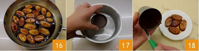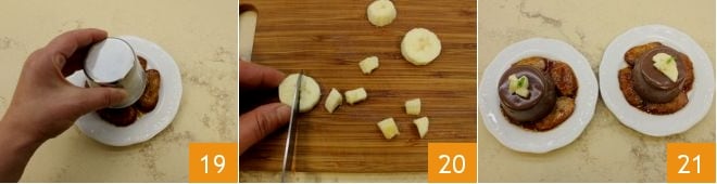Schalten Sie die Hitze aus 16 und verteilen Sie die karamellisierten Bananen auf den Serviertellern. Dann nehmen Sie die Panna Cotta aus dem Kühlschrank und um sie leichter zu entformen, tauchen Sie die Förmchen für einen Bruchteil einer Sekunde in einen Topf mit heißem Wasser 17. Dann helfen Sie sich mit einem kleinen Messer, um die Ränder leichter zu lösen 18