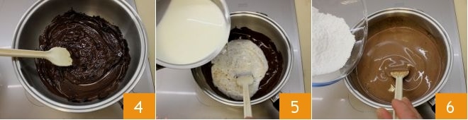 Schmelzen Sie die Schokolade im Wasserbad, indem Sie sie in eine Schüssel geben oder einen kleinen Topf in einen anderen, mit Wasser gefüllten Topf stellen, sodass das Wasser den Behälter, in dem Sie die Schokolade haben, nicht berührt. Rühren Sie um, bis sie vollständig geschmolzen ist 4, fügen Sie dann die separat erwärmte Sahne 5 und den gesiebten Puderzucker hinzu 6. Rühren Sie weiter mit einem Spatel und erhitzen Sie alles bei schwacher Hitze, ohne es jemals zum Kochen zu bringen, und rühren Sie weiter, damit die Schokolade keine Klumpen bildet.