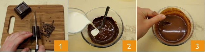 Um den Schokoladenkranz mit Haselnusscreme zuzubereiten, beginnen Sie mit dem Teig des Kranzes: hacken Sie die dunkle Schokolade grob 1 und schmelzen Sie sie im Wasserbad oder in der Mikrowelle. Sobald sie geschmolzen ist, fügen Sie die zuvor erhitzte flüssige Sahne hinzu 2, mischen Sie 3 und lassen Sie sie abkühlen.