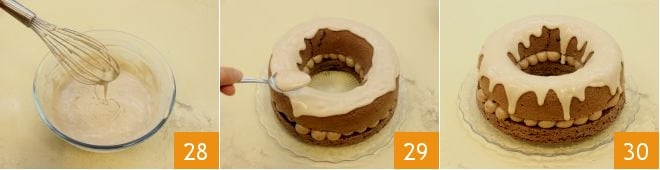verarbeiten Sie die Mischung mit dem Schneebesen, um sie weich wie einen Guss zu machen 28. Verteilen Sie sie mit einem Löffel auf dem Kranz und formen Sie dekorative Tropfen (29-30).