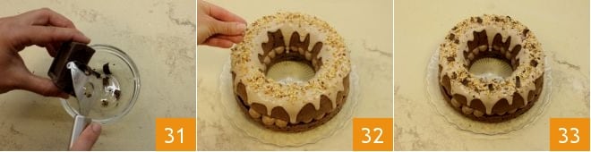 Zum Dekorieren können Sie Schokoladenspäne herstellen, indem Sie mit dem Sparschäler über einen Block dunkler Schokolade fahren 31. Streuen Sie dann den Haselnusskrokant auf den Kranz 32 und die Schokoladenspäne. Ihr Schokoladenkranz mit Haselnusscreme ist bereit, genossen zu werden 33!
