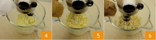 In der Zwischenzeit geben Sie die weiche Butter bei Zimmertemperatur in die Schüssel einer Küchenmaschine (wenn Sie keine Küchenmaschine besitzen, können Sie die Zutaten mit einem elektrischen Handrührgerät verarbeiten), montieren Sie die Schneebesen und beginnen Sie, sie cremig zu schlagen. Fügen Sie den Kristallzucker hinzu 4 und wenn er eingearbeitet ist, fügen Sie den braunen Zucker hinzu 5; wenn die Mischung gut aufgeschlagen ist, streuen Sie auch das Haselnussmehl ein 6.