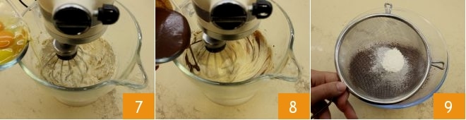 An dieser Stelle können Sie die Eier nacheinander zum Teig hinzufügen 7 und sobald sie eingearbeitet sind, gießen Sie die Mischung aus Sahne und geschmolzener Schokolade in einem dünnen Strahl hinzu 8. In einer Schüssel sieben Sie zusammen den ungesüßten Kakao, das Mehl und das Backpulver 9.