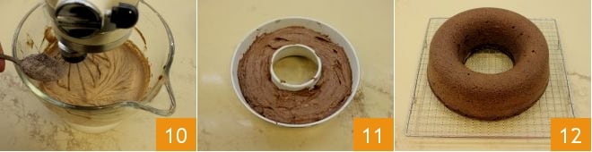 Integrieren Sie nach und nach die trockenen Zutaten mit einem Löffel 10. Wenn der Teig homogen und cremig ist, stoppen Sie die Küchenmaschine: buttern und mehlen Sie eine Kranzform von 26 cm Durchmesser und gießen Sie den Teig hinein, indem Sie ihn mit einem Spatel gleichmäßig verteilen 11. Backen Sie den Kranz im vorgeheizten statischen Ofen bei 180° für 50 Minuten (160° für 40 Minuten, wenn der Ofen belüftet ist). Wenn der Kranz dazu neigt, zu dunkel zu werden, können Sie ihn nach einer halben Stunde Backzeit mit Alufolie abdecken und die restliche Zeit weiterbacken. Sobald er gebacken ist, nehmen Sie ihn aus dem Ofen und lassen Sie ihn leicht abkühlen, dann lösen Sie ihn vorsichtig aus der Form und lassen Sie ihn vollständig auf einem Rost abkühlen 12.