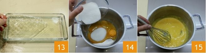Widmen Sie sich der Haselnusscreme für die Füllung: weichen Sie die Gelatineblätter in einer Schüssel mit kaltem Wasser für mindestens 10 Minuten ein 13. In der Zwischenzeit geben Sie die Eigelbe und den Zucker in einen Topf mit doppeltem Boden, bei ausgeschaltetem Feuer 14, verarbeiten Sie sie mit dem Schneebesen, bis Sie eine homogene und flüssige Masse erhalten 15.