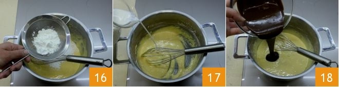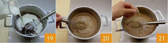 Fügen Sie das gesiebte Maisstärke hinzu 16, mischen Sie erneut mit dem Schneebesen, dann gießen Sie die Milch in einem dünnen Strahl hinzu 17 sowie die Haselnusspaste (es handelt sich nicht um eine streichfähige Creme, sondern sie wird durch Verfeinerung der Haselnüsse gewonnen) 18.