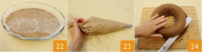 Geben Sie die Creme in eine breite und flache Schüssel, um sie schneller abzukühlen. Decken Sie sie mit Frischhaltefolie ab 22 (um die Abkühlzeit zu beschleunigen, wenn Sie keinen Haushaltskühler besitzen, stellen Sie die Schüssel mit der Creme in eine größere Schüssel voller Eis, damit sie schnell abkühlt und die Konsistenz beibehält); dann geben Sie sie in einen Spritzbeutel mit einer ziemlich breiten, glatten Tülle 23; Sie können die Creme bis zur Verwendung im Kühlschrank aufbewahren. Wenn der Kranz kalt ist, schneiden Sie ihn in der Mitte durch 24.