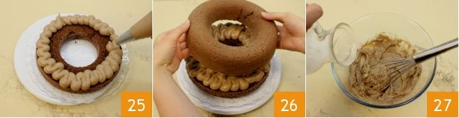 Legen Sie den Boden des Kranzes auf eine Servierplatte und füllen Sie ihn mit der Haselnusscreme 25, dann schließen Sie mit der anderen Hälfte des Kranzes 26. Nun widmen Sie sich dem Guss: Geben Sie die restliche Haselnusscreme in eine Schüssel und verdünnen Sie sie mit der frischen flüssigen Sahne 27;