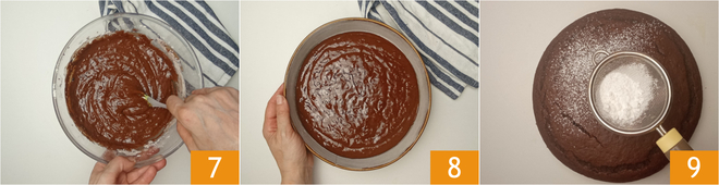 Rühren Sie gut, bis eine glatte und homogene Masse entsteht 7. Gießen Sie die Masse in eine leicht gefettete und bemehlte Form mit einem Durchmesser von 24 cm und glätten Sie die Oberfläche, indem Sie die Form leicht schütteln 8. Backen Sie den Kuchen im vorgeheizten statischen Ofen bei 180° für 40 Minuten in der mittleren Ofenleiste. Führen Sie die Stäbchenprobe durch, um zu überprüfen, ob der Kuchen gar ist. Wenn das Stäbchen trocken herauskommt, ist der Kuchen fertig und kann aus dem Ofen genommen werden. Lassen Sie ihn gut abkühlen, bevor Sie ihn aus der Form nehmen, und garnieren Sie ihn nach Belieben mit Puderzucker 9.