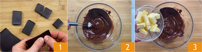 Um das Schokoladenküchlein aus der Heißluftfritteuse zuzubereiten, brechen Sie zuerst die Schokolade in Stücke 1 und schmelzen sie im Wasserbad oder in der Mikrowelle 2. Fügen Sie die Butter hinzu, wenn die Schokolade noch warm ist, um sie gut zu schmelzen 3. Lassen Sie es abkühlen.